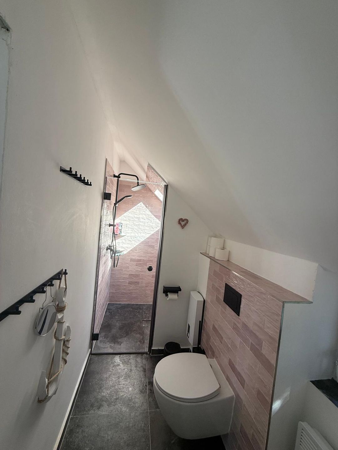 Das Badezimmer ist modern gestaltet und verfügt über eine bodengleiche Dusche, ein Waschbecken, einen Spiegel und ein WC.