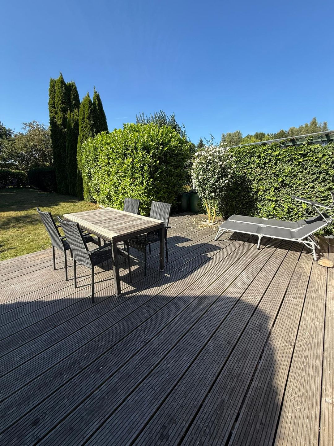 Ein moderner Ofen bietet zusätzliche Wärme und schafft insbesondere in den kälteren Monaten eine wohlige Stimmung. An warmen Tagen ermöglicht die Terrasse mit hochwertigen Gartenmöbeln und Gartenblick ideale Voraussetzungen für entspannte Stunden im Freien. (Holz ist separat mitzubringen.)