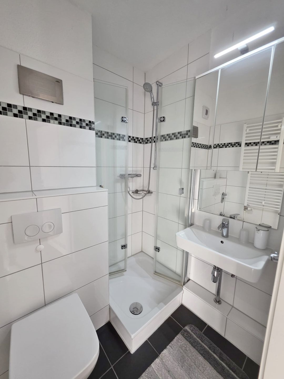 Neu saniertes und schickes Badezimmer mit Duschkabine (flacher Duscheinstieg) und Hänge-WC.