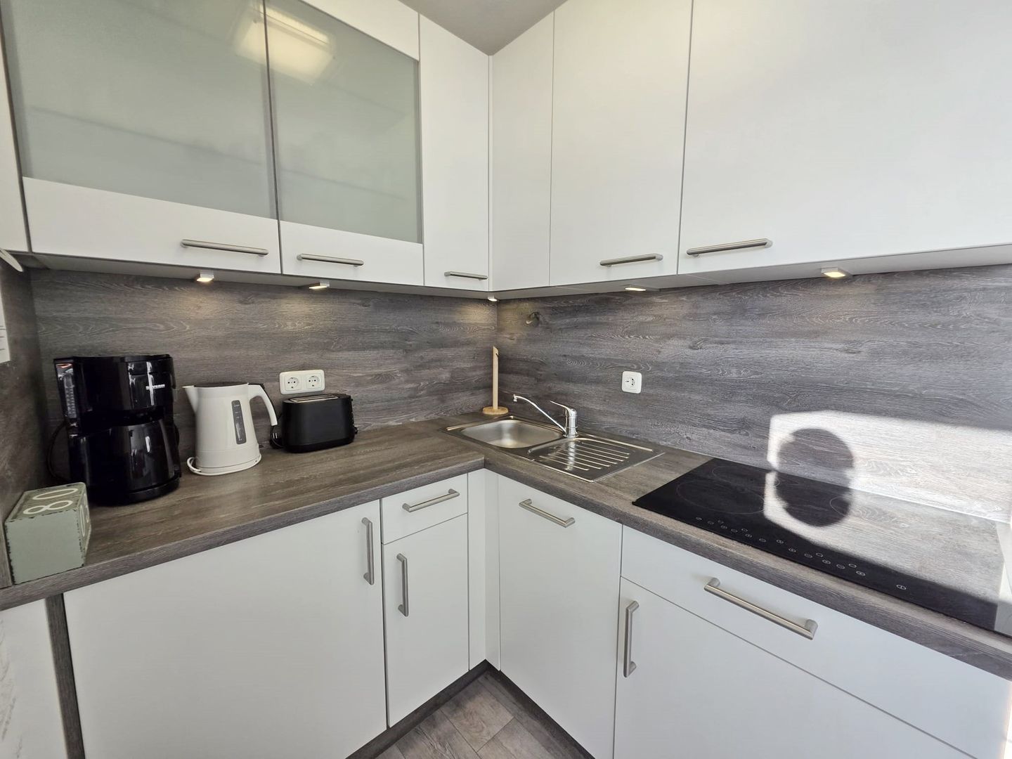 Die offene, neue Küchenzeile verfügt über ein 4er Ceranfeld, Geschirrspüler, Kühlschrank mit Gefrierfach, Wasserkocher und einem Toaster.