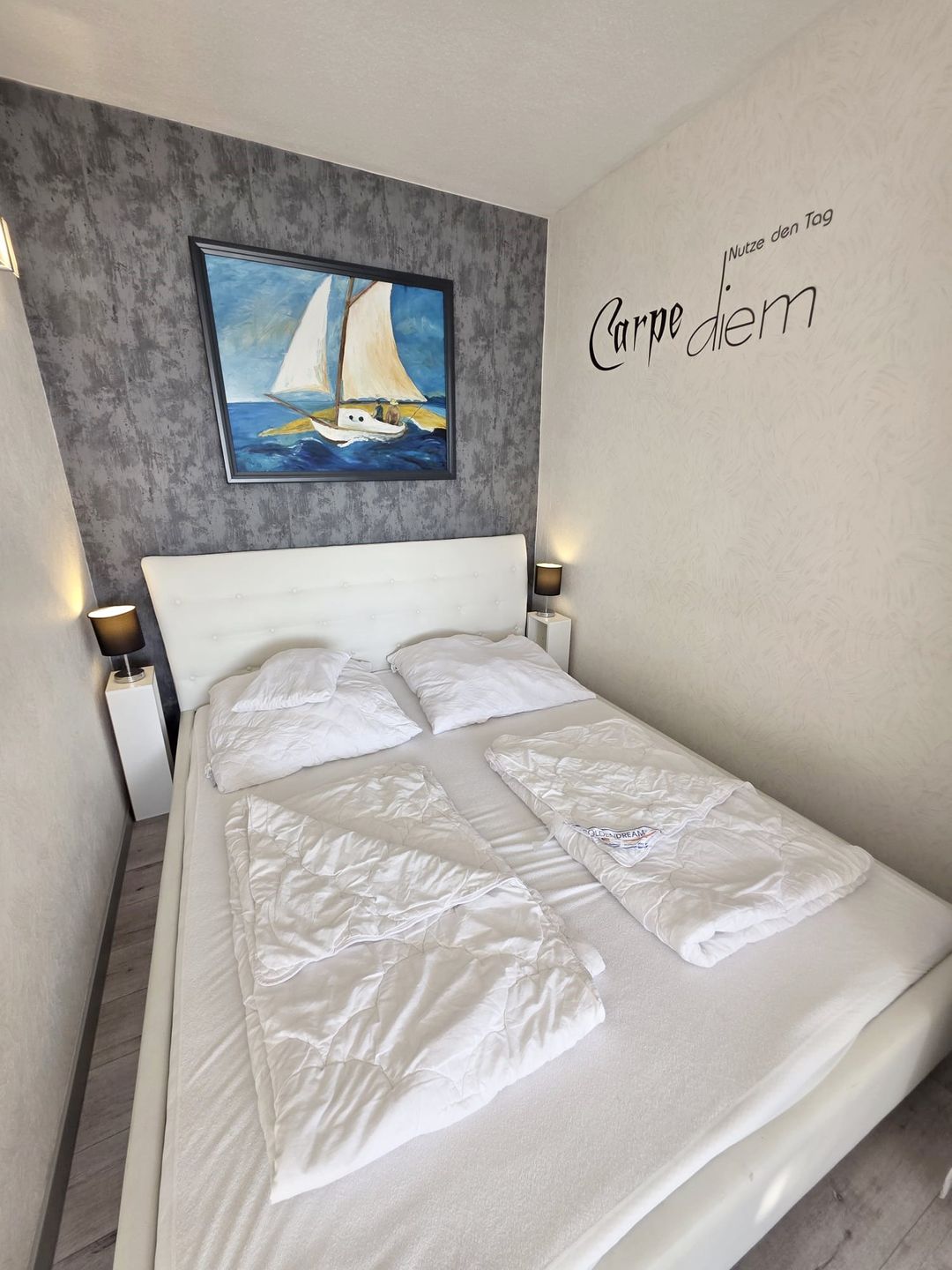 Der Schlafbereich, durch einen Schiebevorhang abgeteilt vom Wohnbereich, ist mit einem Doppelbett (durchgängige Matratze 160*200cm) ausgestattet.