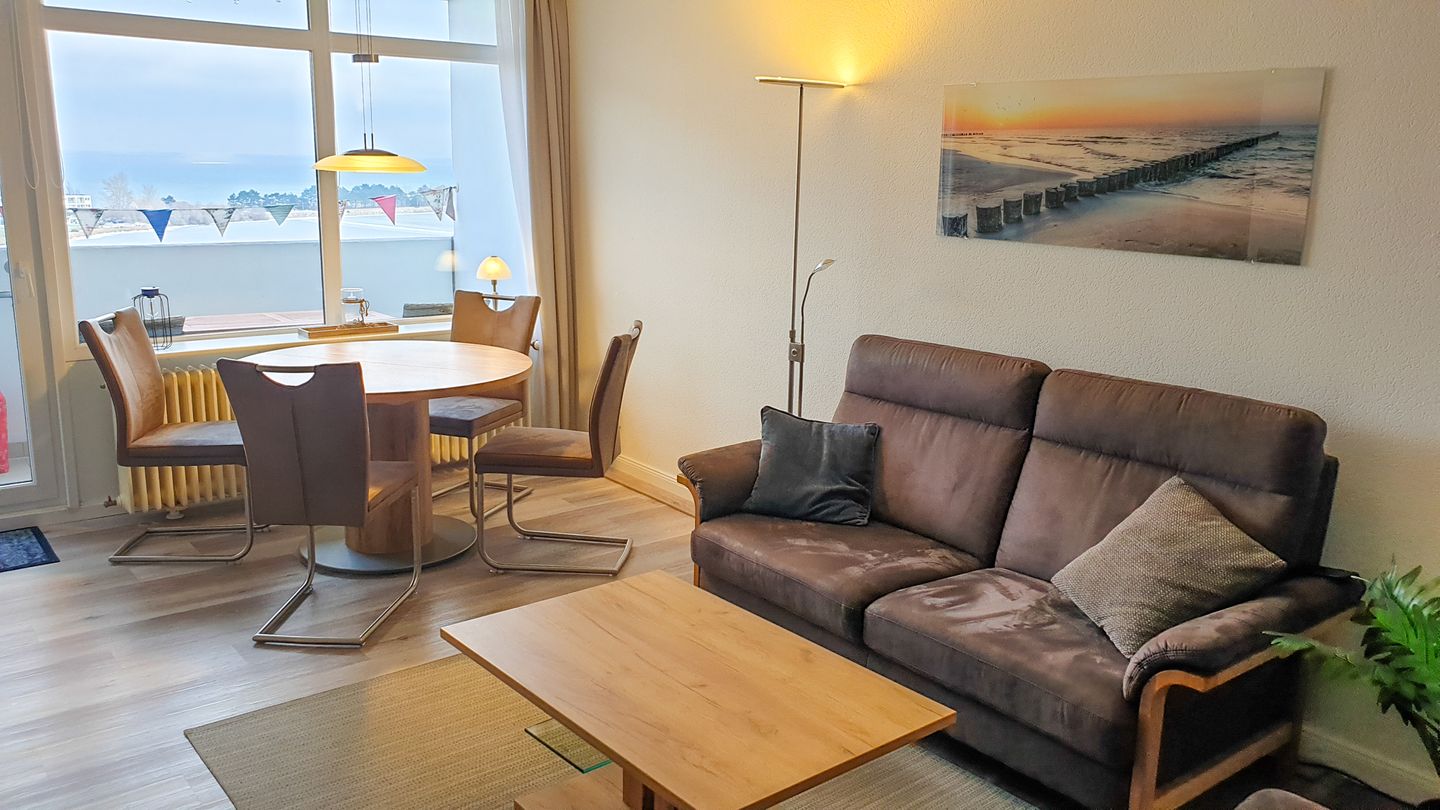 Wohnbereich: Der lichtdurchflutete Wohnbereich lädt mit einer gemütlichen Couch und einem Essbereich direkt am Fenster dazu ein, die atemberaubende Aussicht auf die Ostsee, Fehmarn und die Fehmarnsundbrücke zu genießen.