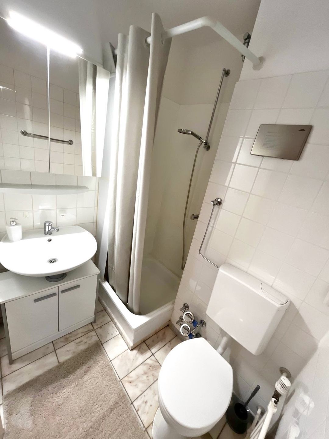 Das Badezimmer verfügt über eine Dusche mit Wanne, Waschbecken, Spiegel und WC.