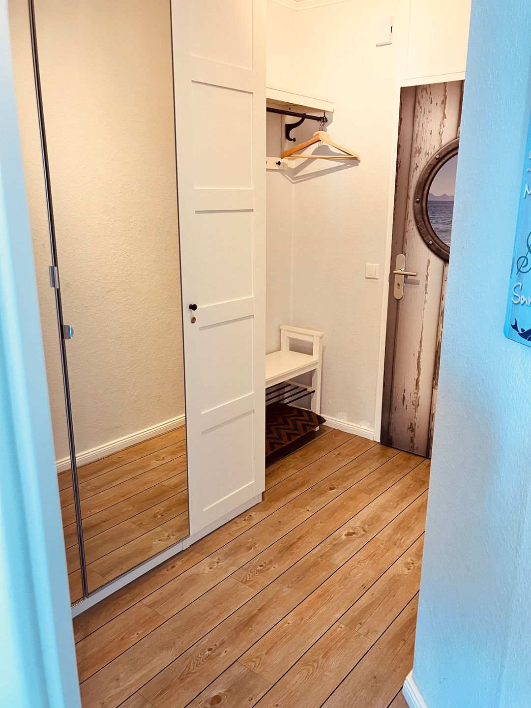 Das helle, modern ausgestattete Badezimmer rundet das stimmige Gesamtbild dieser Wohnung ab. Ein besonderes Highlight ist der kleine Balkon, auf dem Sie entspannte Stunden verbringen und den Tag in angenehmer Atmosphäre ausklingen lassen können. Diese Ferienwohnung vereint stilvolles Wohnen mit einer frischen, maritimen Note und bietet Ihnen den perfekten Rückzugsort für eine erholsame Auszeit.