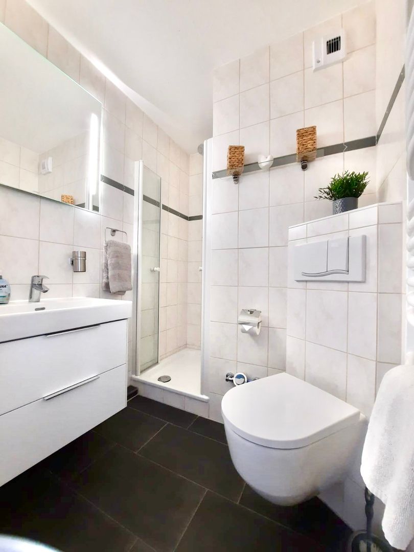 Auch das modern gestaltete Badezimmer mit Hänge-WC, Duschkabine und beleuchtetem Spiegelschrank sowie einem Handtuchheizkörper lässt keine Wünsche offen.