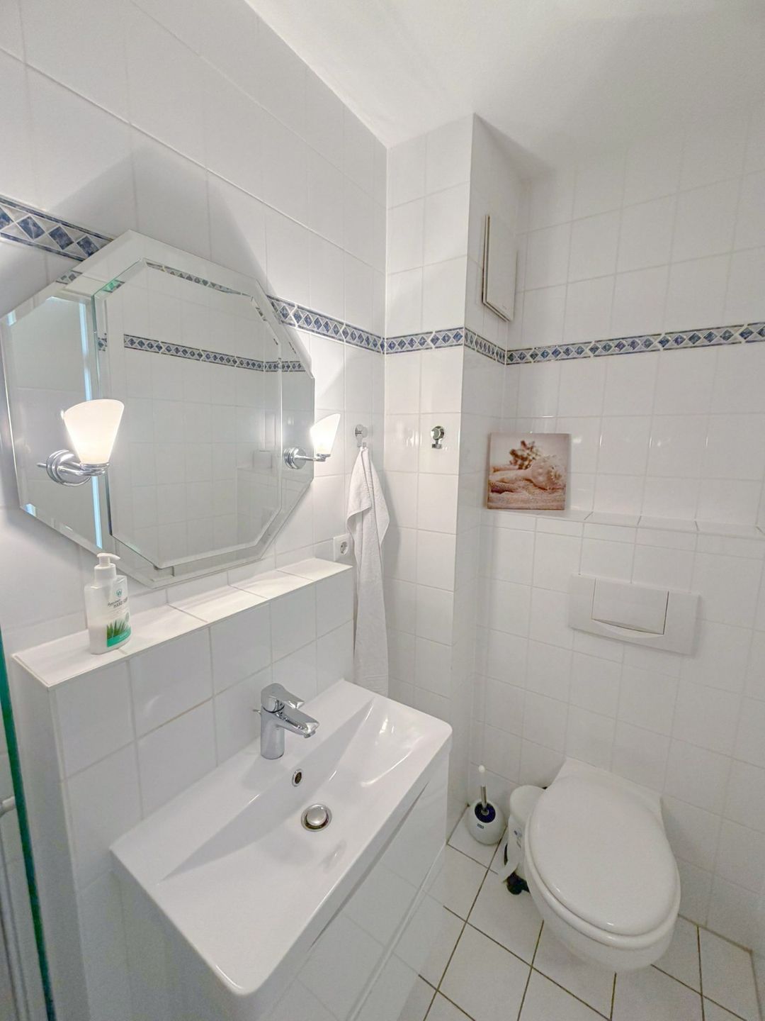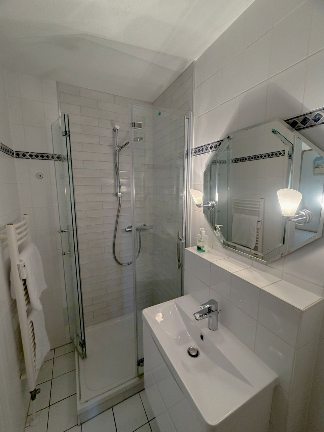 Das helle, innenliegende Duschbad ist mit fester Duschkabine, Waschbecken mit beleuchtetem Spiegel, Handtuchheizkörper, WC und elektrischer Lüftung ausgestattet.