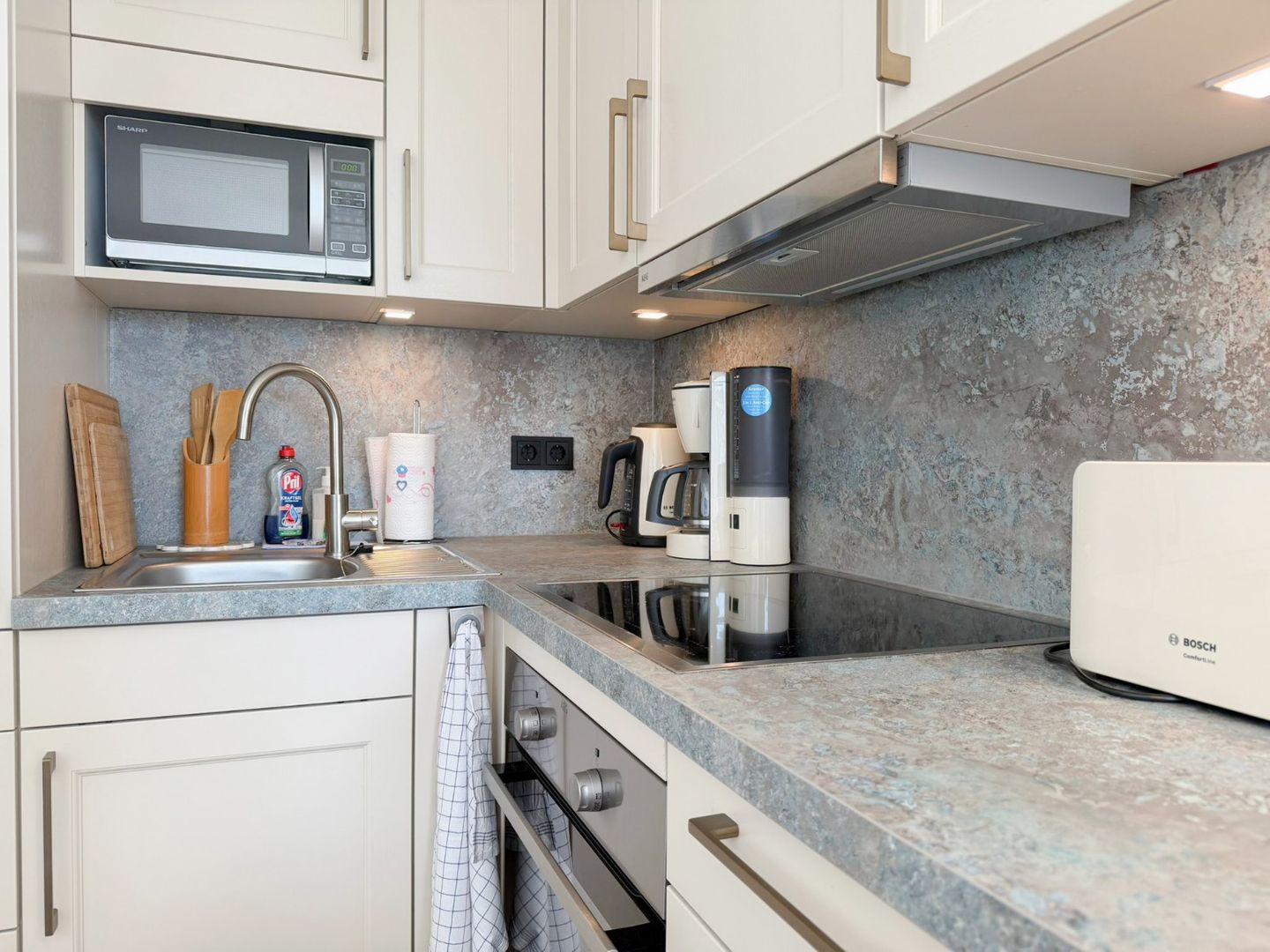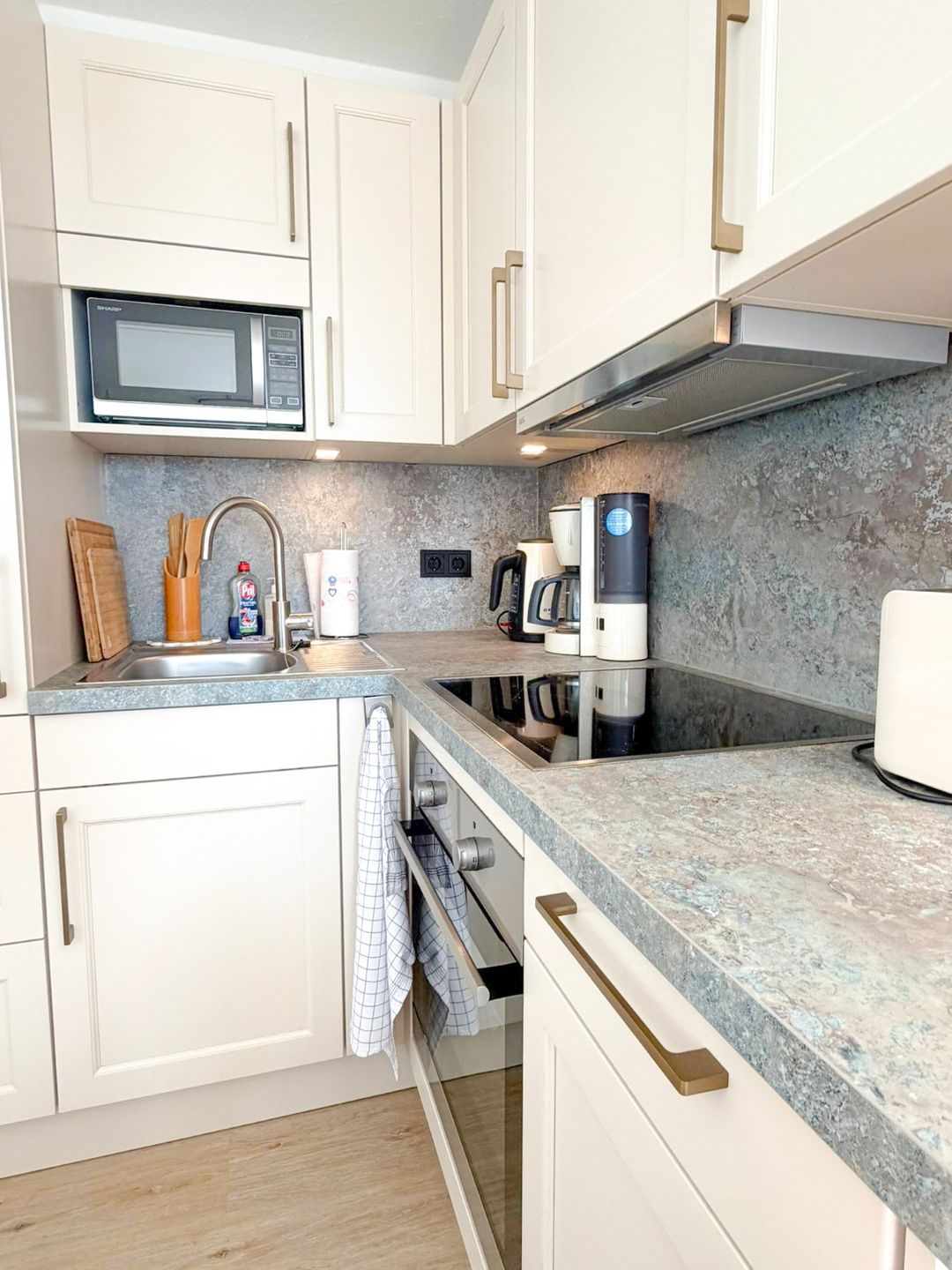 Im kombinierten Wohnraum bietet die Eck-Einbauküche umfangreiche Ausstattung zur Selbstversorgung: 4-Feld-Ceranherd, Backofen, Microwelle und Geschirrspüler sowie Ausstattung zum Kochen und Genießen am anschließenden Esstisch stehen Ihnen hier zur Verfügung.