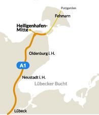 Sie fahren die Autobahn A1 in Richtung Hamburg-Lübeck-Puttgarden und nehmen die Ausfahrt Heiligenhafen Mitte